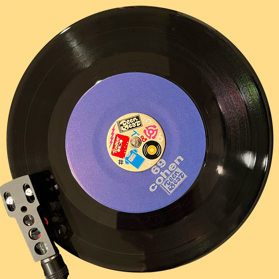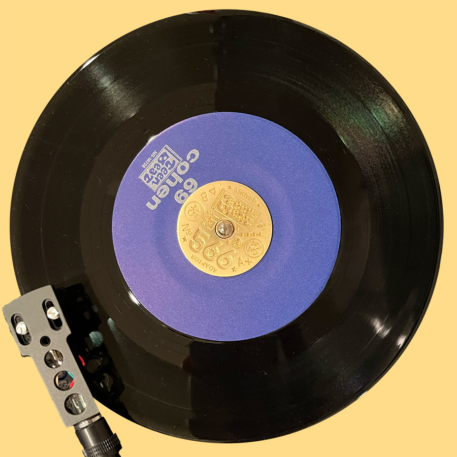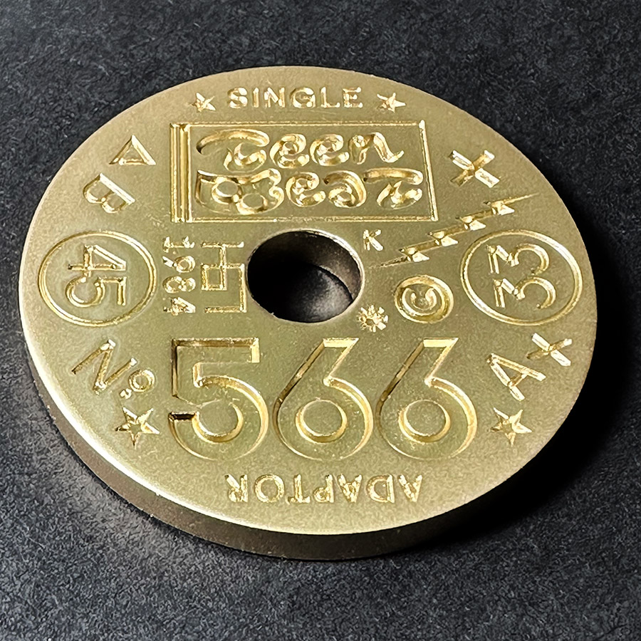 The second edition of our tip-top quality metal adaptor for your seven-inch singles that can be played on a phonograph. One side features important Teenbeat in full-colour, while the other is a collage of logos in glittery gold. All in solid metal with an enamel finish. We've carefully engineered this device to work with singles that run at both 45 and 33. While almost every Teenbeat single has a small center hole, and is not jukebox-friendly, we know a lot of you out there like to play your JONNY COHEN "Space Butterfly" single often and/or once in a while. This high quality adaptor will keep your single centered and playing at a reliable, steady pace. More good news: we have engineered our new Teenbeat 7-inch 45 adaptor to not only work with Teenbeat 69, but also every other single with a large hole. A win-win.